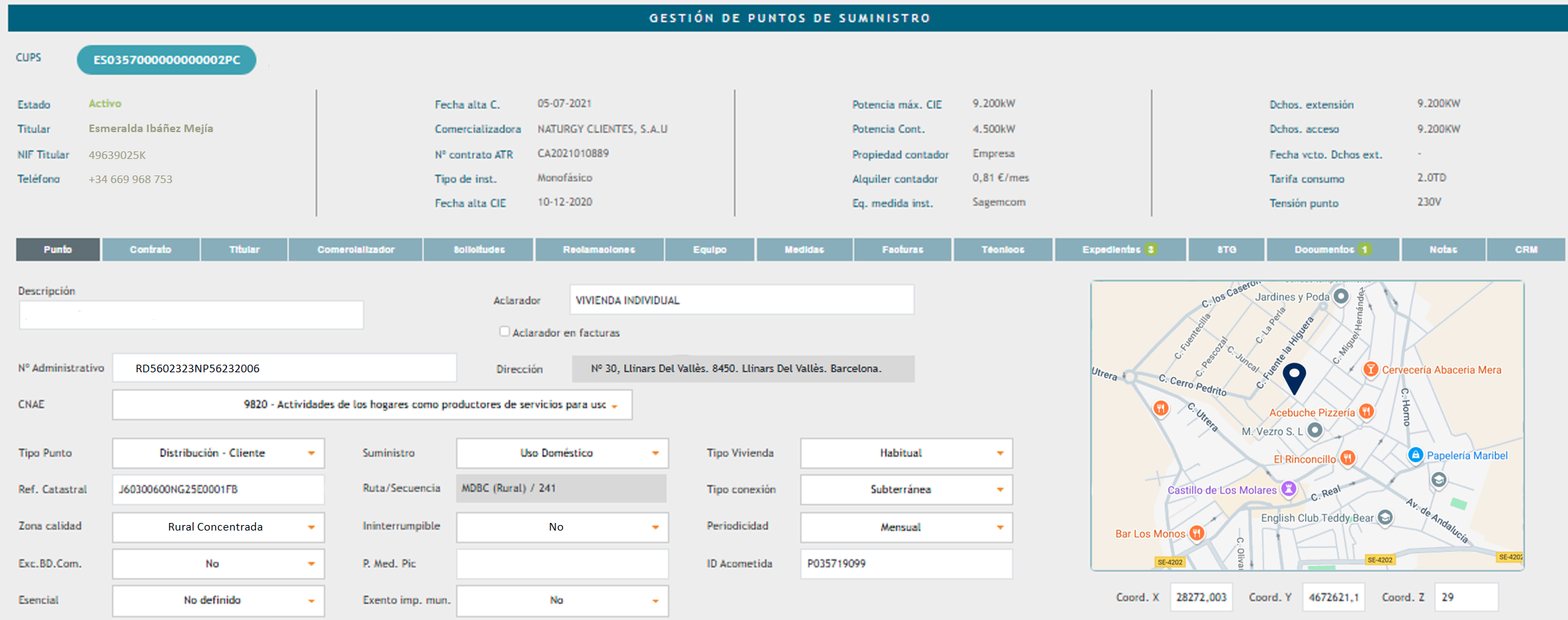 Está organizada en 15 apartados funcionales que permiten visualizar el ciclo completo del punto, consultar eventos históricos y operativos, acceder a documentos y datos clave sin cambiar de módulo